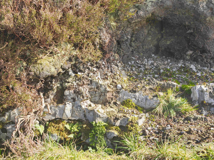 This mixture of a limestone base and a possibly acidic skim of soil on the surface has led to an interesting Flora. Nowhere is the rock deeply buried. It is exposed at the caves and, as indicated by all the cairns, it is readily available