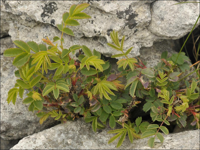 BELOW: Burnet Rose (Rosa spinosissima) Likes limestone pavements and calcareous dunes. Has white to pink flowers.